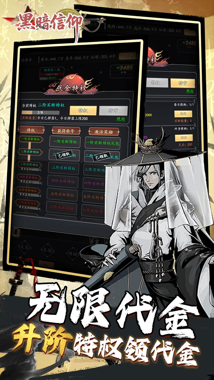 ★全新买断版本,激活不同档位领取代金,最高可激活买断后台,道具任意发 ★上线即送强力红品伙伴,称号、五百万修为、18888仙缘 ★全场畅玩永久0.05折,福利满满、登陆送VIP13 ★沉浸式挂机修仙、游戏内置买断特权,轻松畅游修真界 ★自由修炼,放置成长、飞升证道奖励领领领! ★每日上线登仙修为奖励天天领黑暗信仰#0.05折买断版#截图