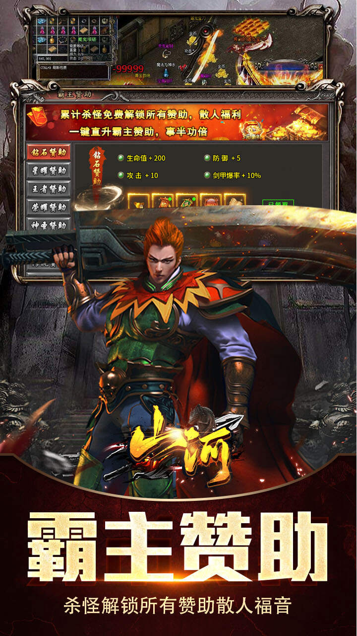 1.上线即送 50元真充红包 面具盾牌套装 勋章血石套装 2.1.85 攻速专属 神器 微变单职业版本 3.神尊系统 攻击幻化神尊姿态 4.霸主赞助 杀怪解锁所有赞助散人福音 5.兵器谱 收集散落各地套装得真充红包山河#高爆福利送充#截图