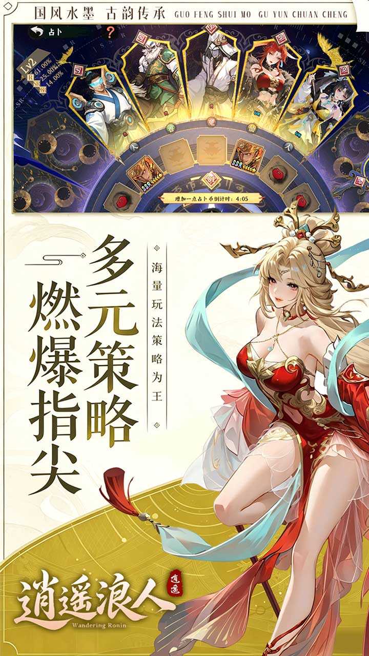 《逍遥浪人》是一款水墨国风策略卡牌手游。在这片充满东方神话色彩的大陆上,你将携手一众耳熟能详的传奇英雄,循着蛛丝马迹揭开尘封之谜,在跌宕剧情中沉浸式领略东方古韵。游戏深度融合策略与操作,多阵容随心搭配,可根据战局灵活组合,在水墨战场施展泼墨般酣畅华丽的连招。探索与奇遇贯穿全程,每一次挑战都将是智慧与勇气的双重试炼。逍遥浪人#1折送绝版皮肤#游戏特色