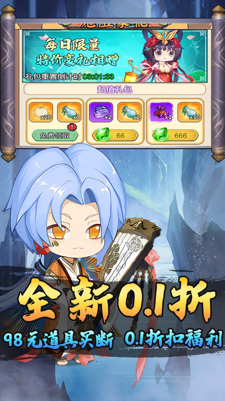 ★全场充值0.1折扣,充值比例1:10 ★进入游戏可以免费领取6480代金卷 ★签到福利:签到灵石材料领不停! ★超值终身卡:每日领取巨额元宝,激活一键扫荡特权轻松完成副本热血格斗#0.1折98元真买断#截图