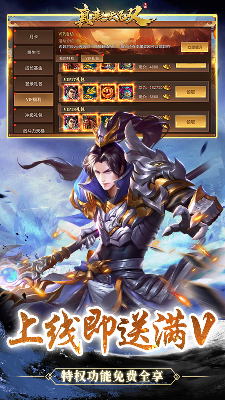 1.充值折扣:充值永久0.05折,福利不打折 2.上线福利:上线送满VIP,顶级武将吕布貂蝉,价值648元宝 3.登录礼包:首日登录免冲直领五虎上将 4.冲级豪礼:免冲激活,达到指定等级领取海量道具 5.战力豪礼:免冲激活,达到指定战力领取海量货币 6.VIP福利:每日免费领取武将,稀有道具低价打折购买 7.登录豪礼:每日登录可领十万充值元宝、1000抽 8.签到豪礼:每日签到直领25资质武将神威吕布、神罗马超 9.七天登录:七天登录每日领取价值888元货币元宝,每天赠100抽! 10.在线奖励:在线立领顶级武将五子良将 11.英雄登场:新版本新增25资质武将“王异”真赵云无双#0.05折免充领貂蝉#截图