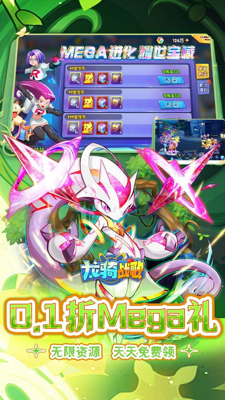 《龙骑战歌》0.1折免费毕业版,免费豪送十万抽!版本毕业精灵每日免费抽,超千真充宝可币每日免费领! 众多宝可梦精灵组合及绚丽的技能,让玩家能融入到幻想世界中增加游戏和战斗的沉浸感,Mega进化,精灵突破Mega形态,解锁全新技能!在全新的地点,遇见全新的伙伴。朝着梦想与冒险的宝可梦世界Let'sGo!龙骑战歌#0.1折免费毕业版#游戏特色