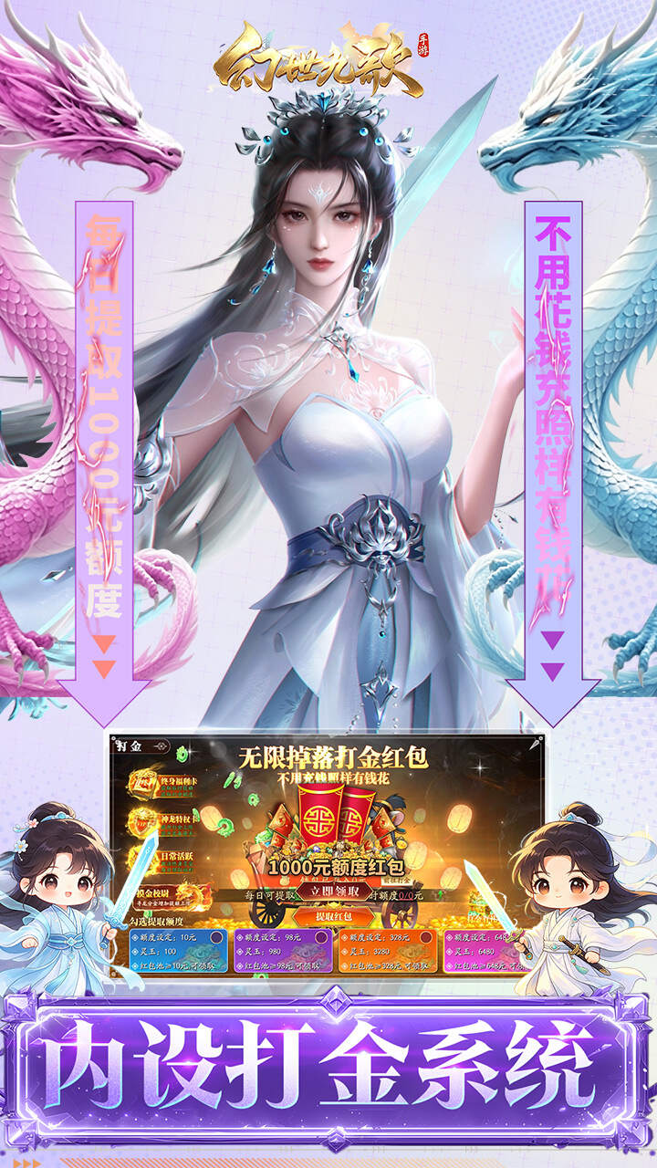 ★【开局福利】开局即送三大外观(价值12000¥):超级坐骑自选宝箱(寒霜炎龙/圣灵渊龙/凝旭幽凰)、羽翼·星陨战翼、服饰·冬季恋歌(礼包码兑换领取) ★【开局福利】开局即送(价值9000¥):新战灵礼包“SP战灵·元天帝鳞”(礼包码兑换领取) ★【开局福利】进游即送启动资金:6480元充值卡+神龙币*888(礼包码兑换领取) ★【游戏福利】0.01折福利:价值几千元直购礼包“直售0.01折只需几块钱拿下”就能拥有“百万游戏币”花不完,永远花不完 ★【游戏福利】每日签到资金·充值卡:“1000元充值卡+328元充值卡+188神龙币”(每日免费参与获取) ★【进游福利】签到福利:送六星战灵任选、各种幻化:翅膀、宠物、英雄:楚羽、御龙九天、乾坤镜等等 ★【游戏福利】内设打金系统:每日打金拿红包,每日可免费提取“1000元额度”不用充值照样有钱花 ★【游戏福利】10倍返利:所有充值通通10倍返利,如:充值1元立即邮件返利发放10元充值卡 ★【进游福利】进游即送:极品聊天气泡框·幸运礼物 ★【进游福利】等级50级即送(VIP礼包):星芒石*30、进化宝石*6、幸运宝石*3 ★【进游福利】等级100级即送:百抽召唤符*100、战力直升宝箱*6、洗灵露*90、战灵经验*150w、初级战灵技能任选箱*3 ★【进游福利】等级150级即送:情花笺*1500、玫瑰花*9、藏宝图*9、秘典+密卷*18 ★【进游福利】 等级110级-500级即送:328元充值卡+648元充值卡+1000元充值卡+2000元充值卡+3000元充值卡+5000元充值卡+10000元充值卡幻世九歌#官方正版#截图